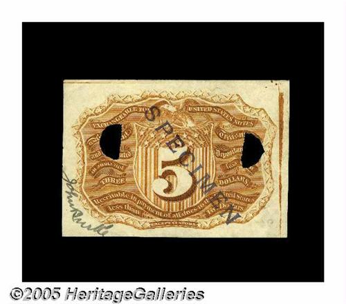 <B>Milton 2E5R.1h 5¢ Second Issue Experimental Back Courtesy Autograph Gem New.</B></I> One of the very few courtesy autographs known on an experimental note. John Burke's signature is darker and clearer than what we are used to seeing. The 5¢ denomination is much scarcer for an experimental note and this one is a real Gem. Prior to receiving the courtesy autograph it was item #46 in Ed Frossard's October, 1893 price list of the Spencer Clark Collection. It is tied to that collection by the penned "46" on its blank back.