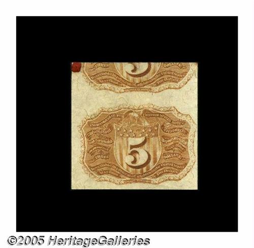 <B>Milton 2E5R.1k 5¢ Second Issue Experimental Gem New.</B></I> This note-and-a-half was cut from a block of ten perfect notes and five half-notes that was part of Milt Friedberg's collection (lot 908). That block contained the only known examples of unstamped, unpunched Fiber Paper 5¢ backs. The purchaser of that block divided the pieces among the active collectors, and this note-and-a-half was Tom O'Mara's share. The top note has a dot of sealing wax, as did each of the half-notes from the original block.