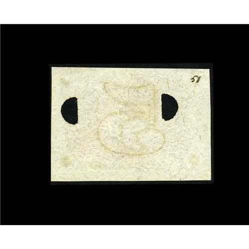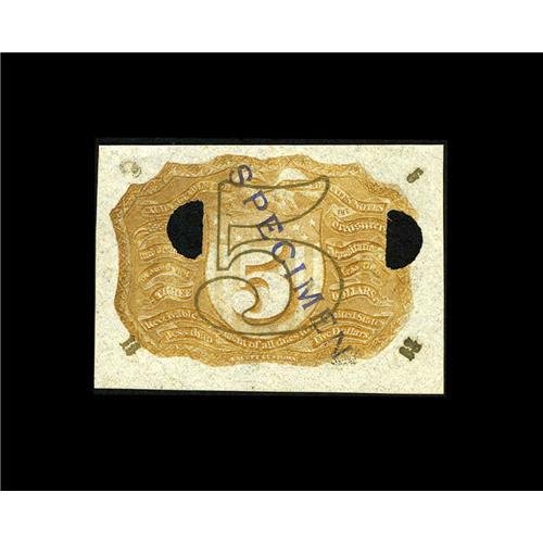 <B>Milton 2E5R.2 5¢ Second Issue Negative Essay Gem New.</B></I> This is one of the very few 5¢ Negative Essays known to exist, and it was listed in the Encyclopedia only from its auction record as Lot 986 from the Chapman Brothers sale of the Friedman Collection on June 3, 1903. The "D-5-18-63" surcharge was not mentioned in the Encyclopedia description, as it was omitted in the Friedman catalog and not known to exist until it turned up in the Collins Collection. This note has a penned "51" on the back that matches the numbers used by Ed Frossard in his October 1, 1893 listing of the Spencer Clark Collection. This note realized over $2,000 when we sold it as lot 909 of our January 1997 Milt Friedberg Collection.