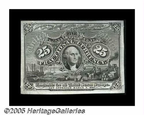 <B>Milton 2S25F.1b 25¢ Second Issue Proof Choice About New.</B></I> This extremely sharp proof-quality printing lacks the bronze oval and is on fine India paper. It's margins are those of a regular issue note, and it appears to have been cut from one of the Treasury presentation books, as it has the identical look of those notes. Ex-Martin Gengerke in 1977, then to Milt, then lot 954 of our MRF sale, to Doug Hales, to Tom in October of 1999.