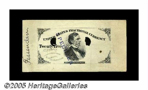 <B> Milton 3E25F.1a 25¢ Third Issue Progress Proof About New.</B></I> From Stack's May 1992 sale of the Alan May Collection, where it was described, "A progress proof of the unfinished face plate, on thick white paper. Wide margins, stamped SPECIMEN in purple, with two half-moon cancellations. 'Fessenden' hand-written in the left margin and with a small brown spot in the right field. Unique and never publicly available before." This piece remains unique to this day, and is one of the most important and valuable pre-production pieces in the Fractional Currency field.