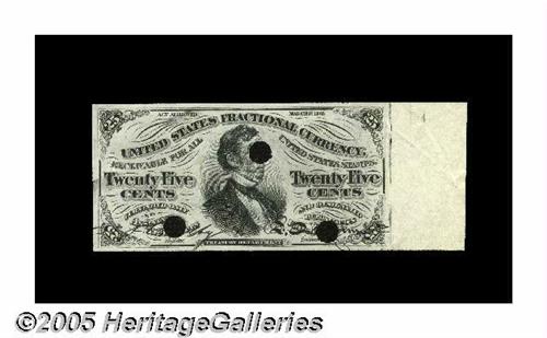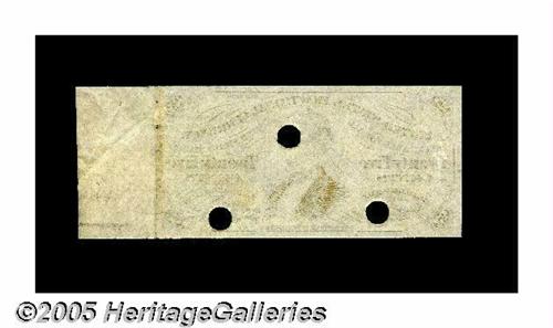 <B> Milton 3E25F.2e 25¢ Third Issue Experimental Gem New.</B></I> There are a few light folds in the one inch wide selvage at the right of this note, but the note itself is flawless. Tom acquired this with his purchase of the Doug Hales Collection, and it is almost certainly one of the two pieces that were severed from the block in the previous lot.