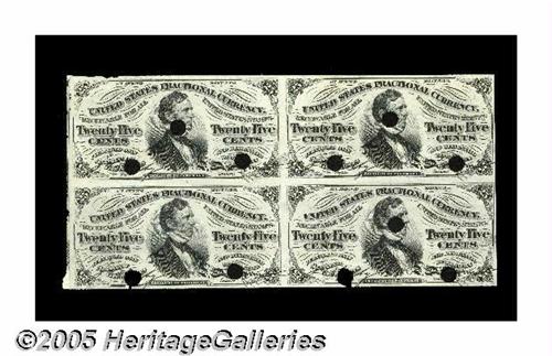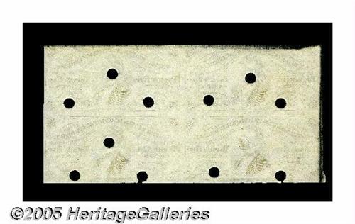 <B> Milton 3E25F.2g 25¢ Third Issue Experimental Block of Four Gem New.</B></I> Previously lot 1094 of our January 1997 Sale, where it was described, "This block was originally offered in the Sotheby's November 5, 1985 Sale as a block of six, but the two pieces at the right were severed and sold, each to a separate collector. The block that [Milt Friedberg] retained contains four incredible Fessenden proofs, the two at the left having the position letter 'a.' The block is clearly from the upper left corner of the plat, as the impression of the edge of the plate is visible. Each of the three notes has three round hole cancels, but in the bottom left note the hole in Fessenden's face was not fully punched and the paper is still present. This is an item of incredible significance, as no experimental multiples from this or any other third issue denomination are known with the position letter present. The condition is spectacular, with all four notes and the block itself grading Gem New, with full original brightness of both the paper and ink." Eight years ago this block realized $2,750, and was one of the great bargains from the Friedberg Sale, having carried an estimate of $6,000-up.