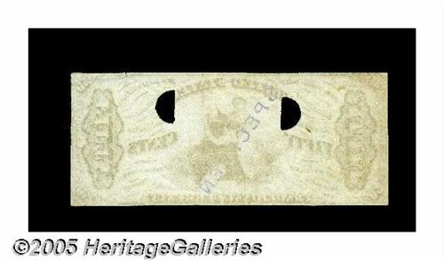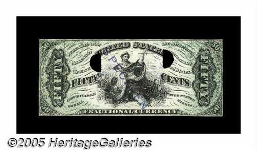 <B> Milton 3E50F.4a 50¢ Third Issue Justice Experimental Choice New.</B></I> A spectacular Justice face printing on soft, thin white paper, with heavy embossing evident on the back. There is a tiny, 1mm split in the top margin, and other than that the piece is flawless. It is from the completed Justice plate, lacking only the signatures and bronzing. The note has the typical "SPECIMEN" stamp, and two half-moon cancels. There is a green-patterned tint heavily printed on both ends of the note that tapers down and eventually disappears before reaching the figure of Justice. Clearly an experiment in anti-counterfeiting techniques. Unique to our best knowledge, it was previously lot 1851 of the 1992 sale of the Alan May Collection. It is the only piece from that sale repurchased by Alan and it was acquired privately directly from him by Tom O'Mara. One of the key pieces in Tom's definitive collection.