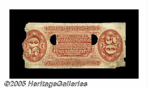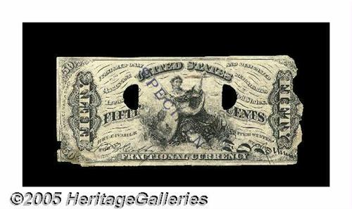 <B> Milton 3E50FR.1 50¢ Third Issue Justice Experimental Fine, Damaged.</B></I> The piece is quite badly damaged with chipping at the lower left corner and much more serious chipping along the entire right end. There are also a number of lesser splits. The note has previously been referred to as an Essay invert, which it kind of is, but it appears to us to have been two separate Essay pieces glued together after printing, with the red back glued upside down. The note clearly was in its present form before being stamped and punched. It was previously lot 163 of Superior's 1982 Fraser Sale, and was acquired by Tom O'Mara when he purchased Doug Hale's Collection. To us, the primary interest of this piece is that it is the only Third Issue Red Back Experimental we know of in any form. In spite of its rather shop-worn appearance, there is some real value here.