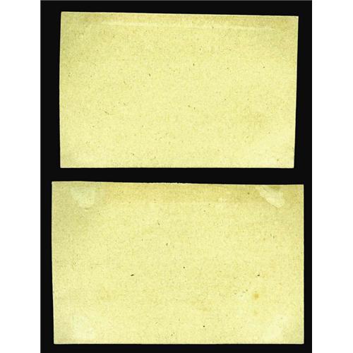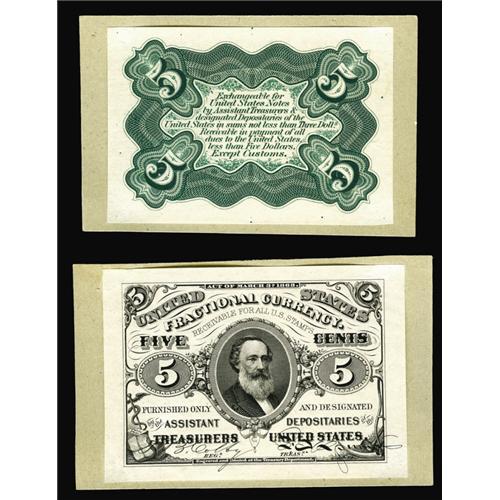 <B>Milton 3S5F.1c & 3S5R.2b 5¢ Third Issue Proof Pair Gem New.</B></I> From our sale of the Dr. Wallace Lee Collection in January 1999, where they were described, "Acquired by Dr. Lee from NASCA's April 12, 1981 sale of the Rockholt Collection. These are exceptionally sharp, perfect proofs done on soft white paper which is glued lightly at the tips to a gray light-cardboard backing. They are identical to the notes that appear mounted in the Treasury Presentation books." At that sale, the pair was estimated at $1,000-up and tripled our estimate, realizing $3,080. We would expect that they will do somewhat better than that this evening.
