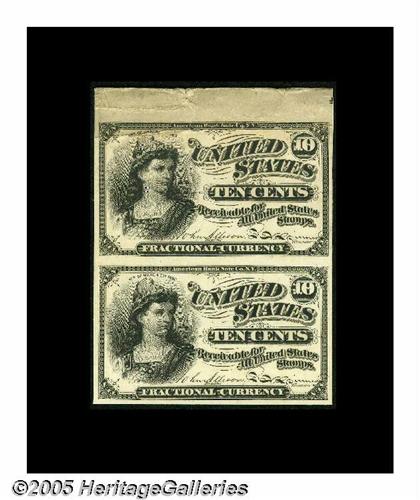 <B>Milton 4E10F.2 10¢ Fourth Issue Essay Horizontal Pair.</B></I> Previously lot 1099 of our January 1997 Friedberg Sale. We described it there as: "A vertical pair cut from the only known sheet at the 1986 Memphis show. The sheet was discovered intact in the Fall of 1985 in Massachusetts. It made its way to the Grand Central Show in New York and it was cut into pairs and singles in Memphis in June of 1986. The notes were divided up by the active Fractional collectors in attendance at that show. Many of the notes from the edge of the sheet had tears and folds but the internal notes were perfect. This pair has one of each: the top note is lightly folded at its upper edge and has a short tear; the bottom note is a perfect, flawless <B>Gem.</B></I> This cardboard proof is from the completed plate of the Fourth Issue 10¢, lacking only the seal. It's unlisted in the Encyclopedia, as none were known to exist prior to the discovery of this sheet." Tom acquired this pair in that auction. The vertical pair in the next lot had been Doug Hales' share from the original sheet when it was cut in 1986. Tom acquired that when he purchased Doug's collection.