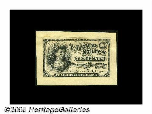 <B>Milton 4E10F.2a 10¢ Fourth Issue Essay Choice New.</B></I> A gorgeous fully detailed Essay printed from a finished plate on soft white paper, which has been mounted by its upper corners to a light card. There are two small punch holes, one at each signature, and the note has a little light wrinkling from the mounting. Acquired privately by Tom with a group of similar Essays directly from R.M. Smythe. To our best knowledge, this is only one of three examples known.