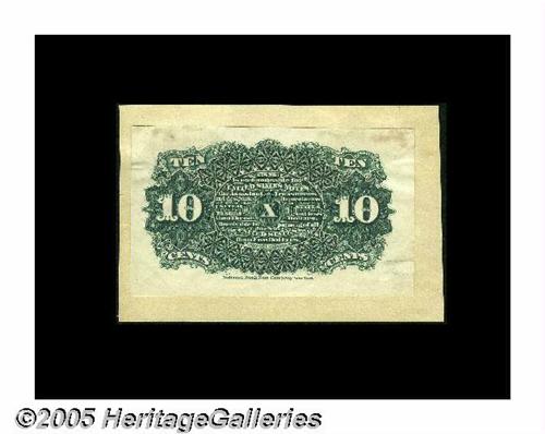 <B>Milton 4E10R.1 10¢ Fourth Issue Back Essay About New, Damaged.</B></I> The mounting is identical to that of the previous lot, and this is the back that goes with that face. Again, the note is mounted on light card by its upper corner tips. This note has a corner fold and a few short tears, but Tom considered it to be unique and to our best knowledge, he is correct. All Fourth Issue Back Proofs and Essays are extraordinarily rare or unique.