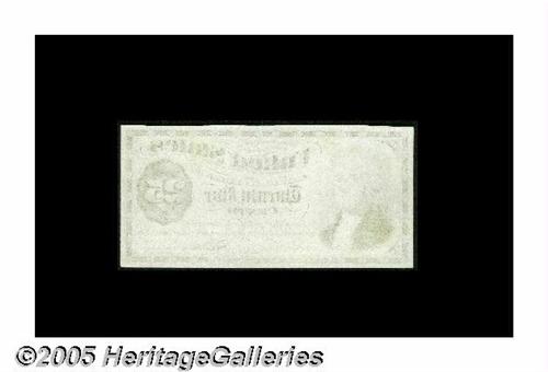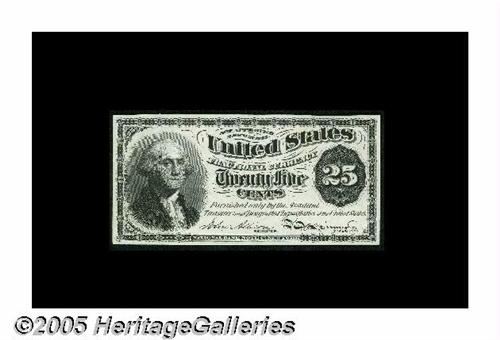 <B>Milton 4S25F.1 25¢ Fourth Issue Plate Proof Gem New.</B></I> Previously from our Friedberg Sale lot 1102, where it was described as: "An utterly Superb Proof of the 25¢ Fourth Issue note pulled from the finished plate onto soft, white India paper. Very few Fourth Issue Proofs are known. This note is represented by only two other known examples--one of which is in the Smithsonian, and both of which have hole-cancels in the signature block and wide margins. This piece, which has margins the size of a normally issued note, is the only known proof of the finished plate that is uncancelled. The printing is razor-sharp, obviously from a brand-new plate, and possibly from the master. The paper, although appearing to be the normal India Proof Stock at a glance, has a scattering of red fibers in it. Nothing could be more rare, and the condition is utterly unimprovable." This piece had previously been lot 2326 from NASCA's Rockholt Sale.