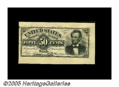 <B>Milton 4S50F.1a 50¢ Fourth Issue Proof Choice About New.</B></I> An incredible item that we have certainly never seen before and one of a very few special printings of the 50¢ Lincoln notes of any form on any paper. The Milt Friedberg Collection did not contain any form of Lincoln Specimen or Proofs. Luckily, this piece is in far better condition than many of the others from this same purchase. There are some minor surface wrinkles, but no tears or other problems, and the note is uncancelled and very well margined. One of the most important pieces in this collection, which contains so many great notes that it becomes hard to select the best. This one is easy--it's one of the best.