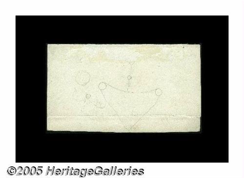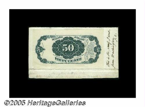 <B>Milton 5DP50R.1 50¢ Fifth Issue Die Proof Choice About New.</B></I> A wonderfully strong impression of the 50¢ Fifth Issue back on India paper. When we sold this as part of Milt Friedberg's collection, the piece had separated from its important backing card. Tom has lightly remounted it with archival hinges at the bottom so that the back of the note and the heavy embossing on the card can be easily seen. The backing card has marginal notations making suggestions for the improvement of the piece, "Strengthen bottom line," "Some of the letters in Fifty Cents appear to need a little cutting," and in a separate hand, "This is the proof I recd. from Washington. J.E." This is an item whose existance was unknown until it appeared in Superior's February 1, 1982 Sale of the Fraser Collection. The Proof itself is perfect but for two very minor problems--a tiny missing corner-tip and a split of about one quarter-inch in the bottom margin, free of the design. An incredible Die Proof from an issue and denomination from which these items are so rare as to be essentially non-collectable.
