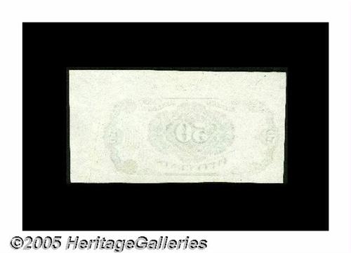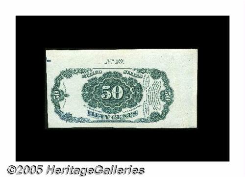 <B>Milton 5E50R.3 50¢ Fifth Issue Proof About New.</B></I> Acquired by Tom in his purchase of the Hales' Collection. This piece is the plate single Proof from plate 29. It has one very light fold through the design and a very long tear outside of the design area, which has been rather well repaired. The piece originally appeared in the Chapman Brothers Sale of Wilcox Collection in 1903.