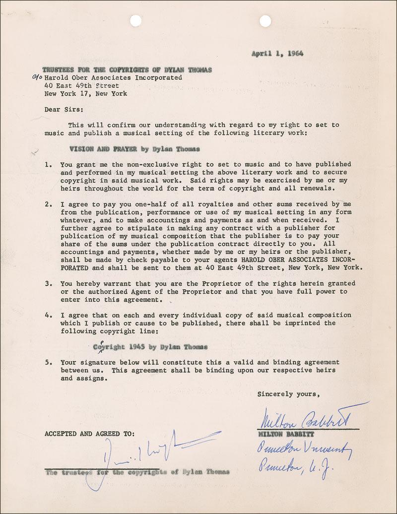 Composer known for his serial and electronic music. DS, one page, 8.5 x 11, April 1, 1964. Agreement between Babbitt and the trustees for the copyrights of Dylan Thomas, for Babbitt “to set to music and publish a musical setting for the following literary work: Vision and Prayer by Dylan Thomas.” Signed at the conclusion by Babbitt, who adds his address underneath. In fine condition, with some scattered light toning and soiling, and a staple and punch holes to top edge.