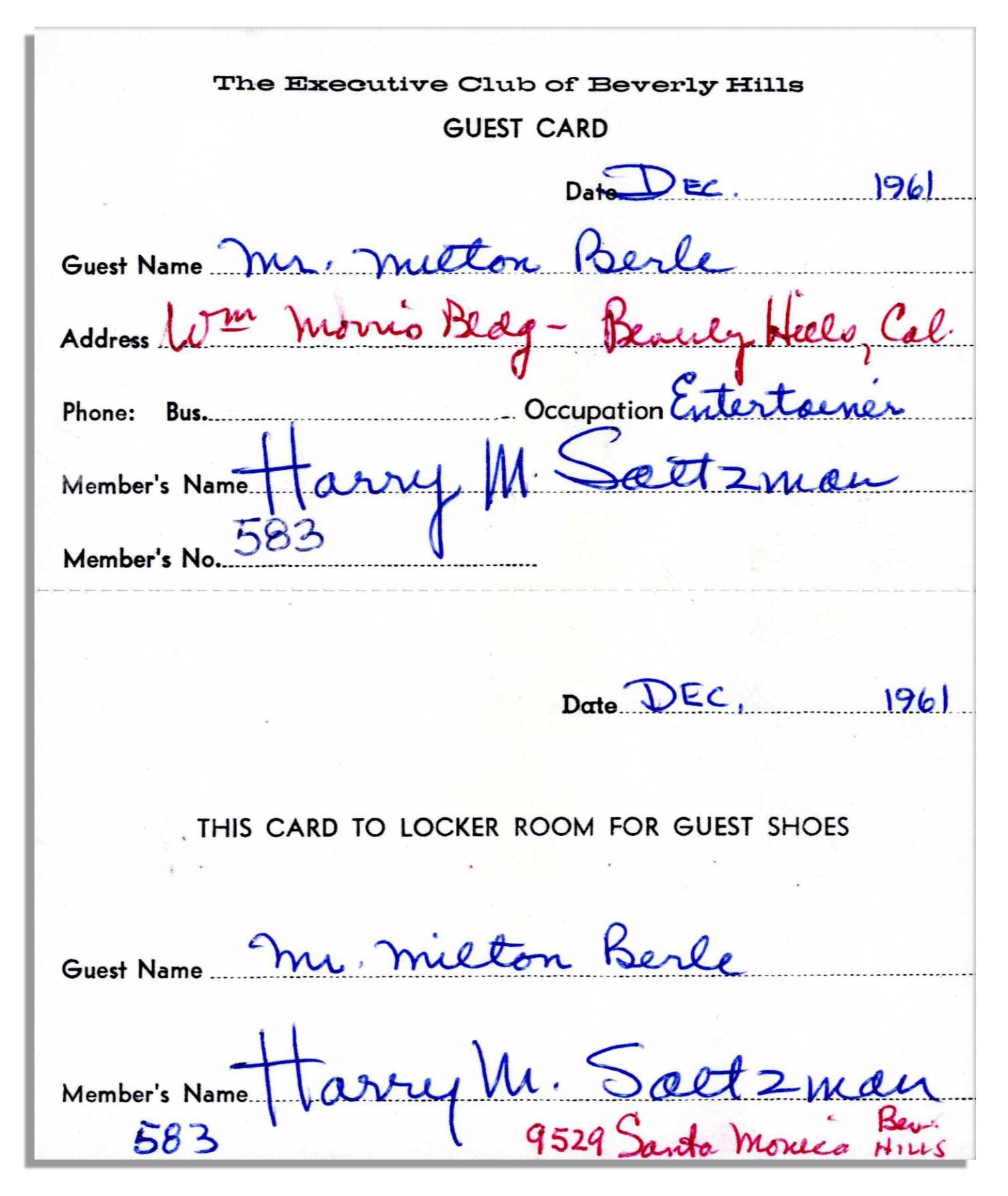 Guest pass admitting Milton Berle to The Executive Club of Beverly Hills in 1961. Partially-printed pass is filled out by an unknown hand for ''Mr. Milton Berle'' listing his occupation as ''Entertainer'' and address as the ''Wm. Morris Bldg.'' Berle was a guest of one Harry M. Saltzman. Card, with perforated line through center measures 5'' x 6''. Near fine. From the Milton Berle estate.