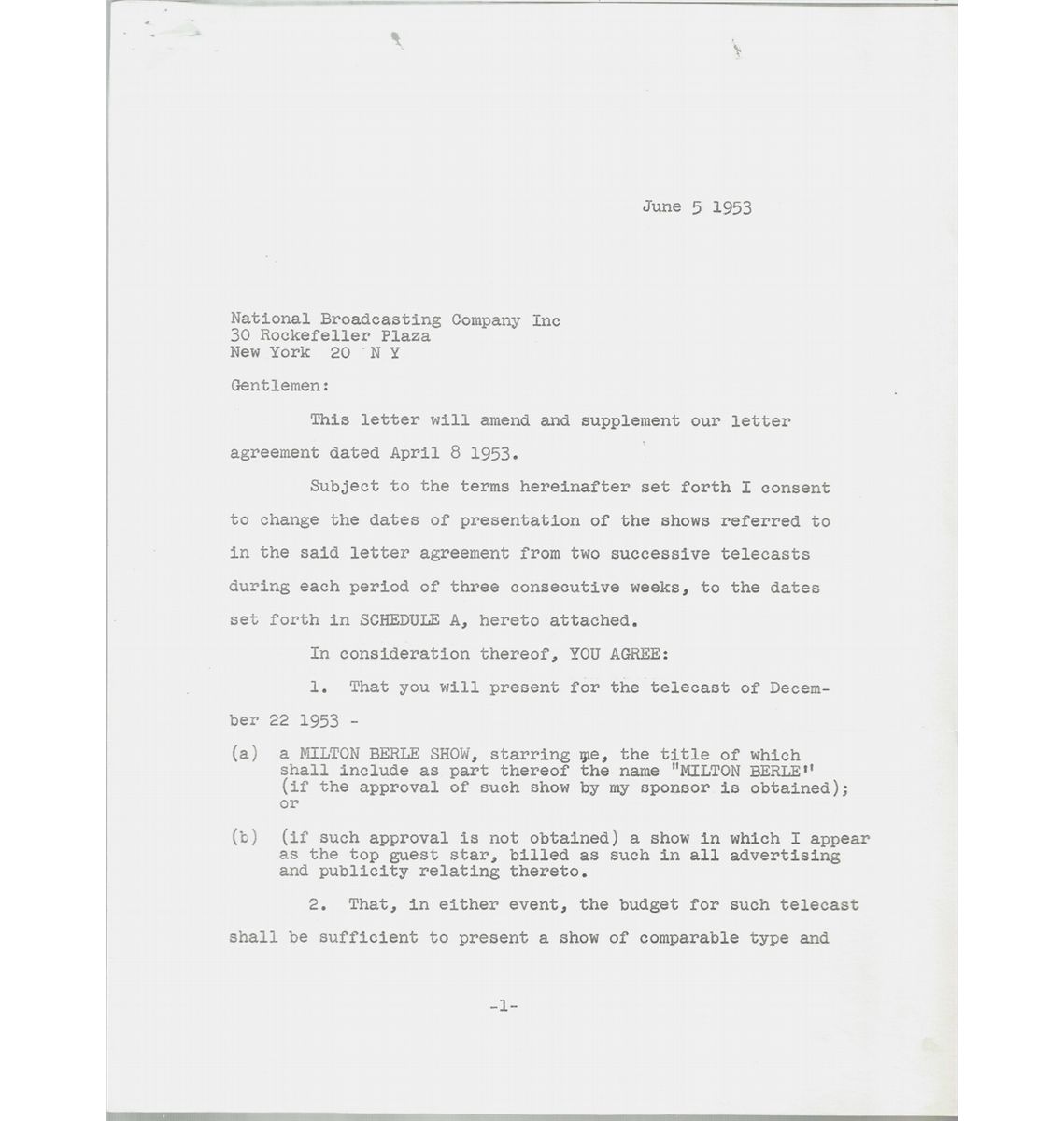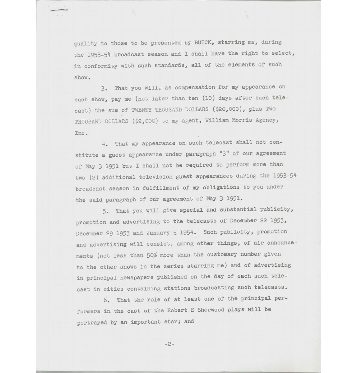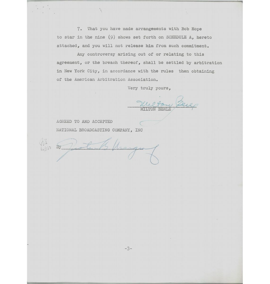 Three page original contract with NBC regarding his TV show signed in 1953 in the infancy of television