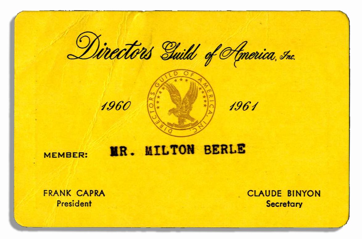 Actor Milton Berle's 1960-61 Directors Guild of America membership card. Card features the organization's logo with Berle's name printed in type. Verso of card lists Directors Guild office locations. On yellow cardstock measuring 3.5'' x 2.25''. Slight crease runs through center, else near fine. From the Milton Berle estate.