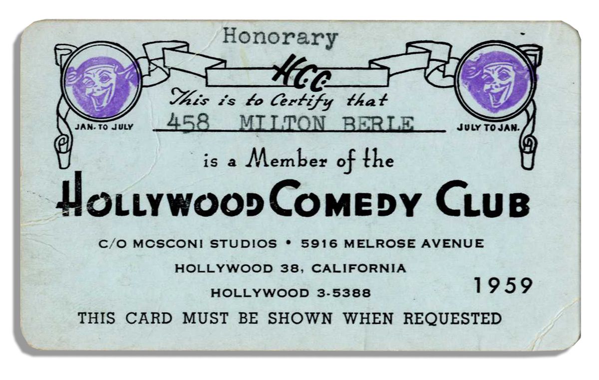 Milton Berle's membership card to the Hollywood Comedy Club from 1959. Berle's name is typed near the top of the pale blue paper card. Measures 3.75'' x 2.25''. Creasing, else near fine. From the Milton Berle estate.