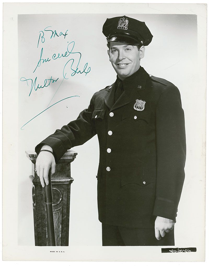 Vintage glossy 8 x 10 photo of Berle in a policeman’s uniform, signed and inscribed in green fountain pen “To Max, Sincerely, Milton Berle.” Scattered creases and surface marks, and binder dings to left edge, otherwise fine condition.
