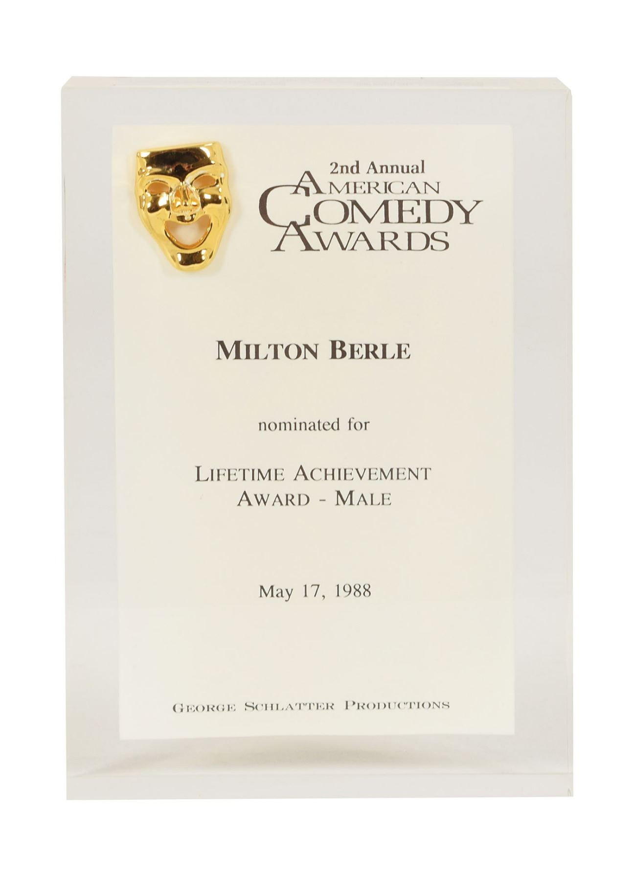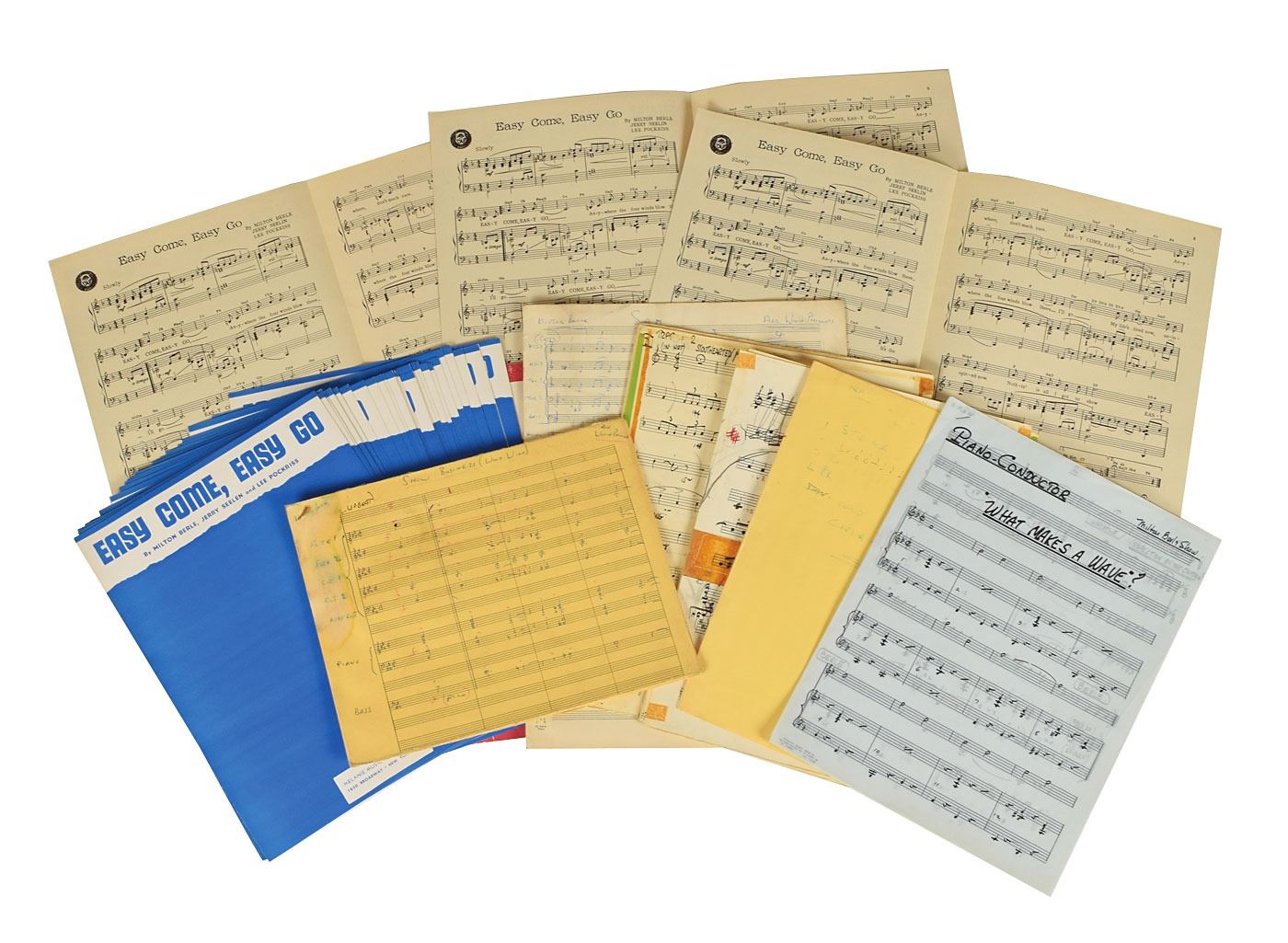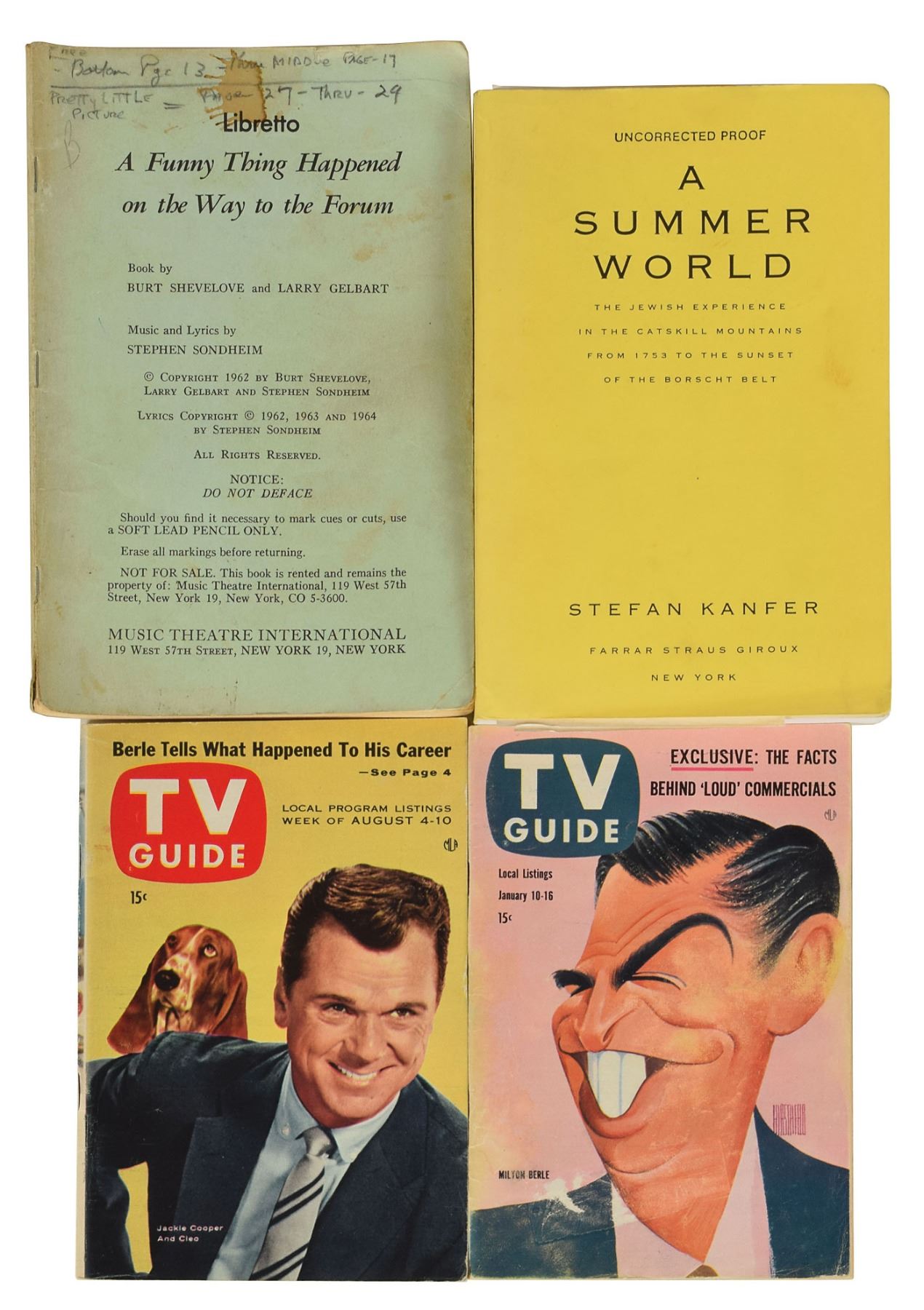 Archive of material from the personal estate of entertainment legend Milton Berle, consisting mostly of musical material and financial paperwork relating to his impressive career on stage, television, and film, with much of the archive annotated or marked in Berle’s own hand. The archive includes: a Libretto booklet for the 1962 musical A Funny Thing Happened on the Way to the Forum, with the interior heavily annotated in pencil and multicolored felt tip by Berle, who ultimately turned down the role of Pseudolus; a pair of large musical arrangement spiral-bound folders relating to “The Royal Quartette,” both filled out and annotated in pencil and ink; numerous sheet music packets and arrangements for both stage and screen, annotated in pencil and various ink types, with titles including “Texaco Theme,” “What Makes a Wave,” “Stouthearted Men,” “Wonder Tag,” and “Show Business (Wood Wind)”; a one-sheet movie poster for the 1942 film A Gentleman at Heart, with splits to several of the folds; several packets listing Berle’s performances on the Texaco Star Theater and The Buick-Berle Show programs between 1948 and 1955, as well as others relating to his one-season run of the Milton Berle Show in 1966; a group of 35 sheet music booklets for ‘Easy Come, Easy Go,’ and one for the song ‘I’; a large assemblage of various papers regarding Berle Enterprises, royalties, receipts, tax statements, credit authorizations, work-for-hire agreements, and trademark assignments, with five titled: “Milton,” “Milton Berle’s Humidor,” “Milton Berle,” “We Drink, We Smoke, We Gamble,” and “Life Is a Gamble”; a lifetime achievement nomination plaque from the 2nd annual American Comedy Awards, dated May 17, 1988; TV Guides for August 4–10, 1956, and January 1–16, 1959; an uncorrected proof copy of A Summer World, softcover, with transmittal letter forwarding the book to Berle; and various printouts, finance records, tax documents, and packets relating to Berle’s extensive acting credits. In overall very good to fine condition.