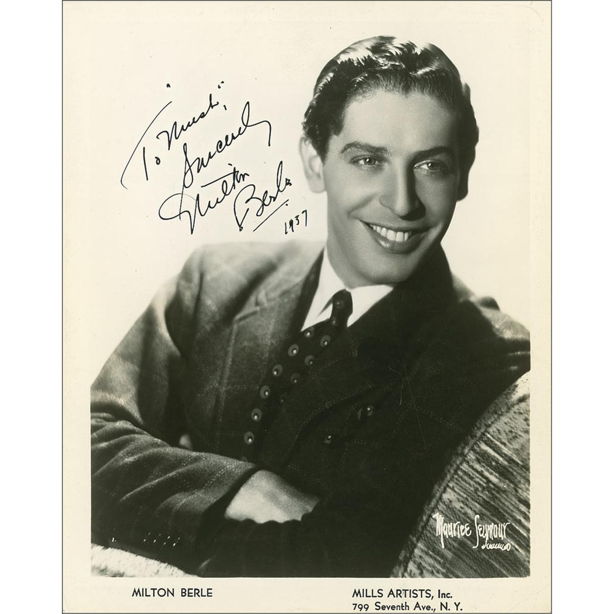 Vintage glossy 8 x 10 publicity photo, signed and inscribed in fountain pen “To ‘Mush’ Sincerely, Milton Berle 1937.” In fine condition, with a few light surface marks and impressions.