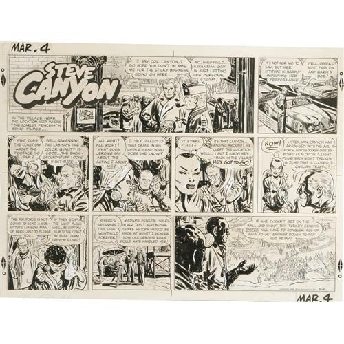 <B>Milton Caniff - Steve Canyon Sunday Comic Strip Original Art, dated 3-4-56 (Field Enterprises, 1956). </B></I> Steve Canyon has his hands full handling the many moods of silver screen siren, Savannah Gay, in this Cold War classic. This strip is a sterling example of Caniff's use of stark shadows and detailed backgrounds, as well as his mastery of facial expressions, and the dynamic pacing of his storytelling. This Sunday has an image area of 24" x 17". The individual panels were glued to a larger support board; otherwise, the art is in Very Good condition. <BR><BR><b>Shipping:</b> Flat Material, Large (<a target="_blank" href="http://www.heritageauctions.com/common/shipping.php">view shipping information</a>)