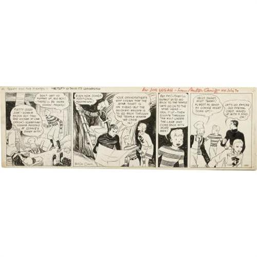 <B>Milton Caniff - Terry and the Pirates Daily Comic Strip Original Art, dated 1-10-35 (Chicago Tribune, 1935). </B></I> In the history of comic strip art, <I>Terry and the Pirates </B></I>was a landmark. It became a masterpiece of storytelling coupled with crisp, elegant artwork, and Milton Caniff virtually redefined the adventure strip. Expert use of black shadows and panel layout give this piece fasted-paced drama. This strip has an image area that measures 20" x 6", and aside from some edge wear and light soiling, the art is in Excellent condition. This daily was signed and inscribed by Milton Caniff in its upper border. <I>From the Jim Logan Collection.</B></I><BR><BR><b>Shipping:</b> Flat Material, Small (<a target="_blank" href="http://www.heritageauctions.com/common/shipping.php">view shipping information</a>)