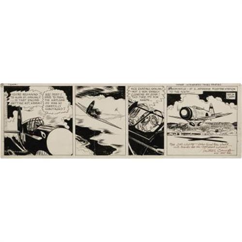 <B>Milton Caniff - Terry and the Pirates Daily Comic Strip Original Art, dated 1-25-44 (Chicago Tribune, 1944). </B></I> Four panels of high-flying Milton Caniff action highlight this World War II-era <I>Terry</B></I>. This episode features masterful inking, as always, by one of the mainstays of action-adventure cartooning. This strip has an image area of 21.5" x 6.5". The condition of the art is Good, with a bit of paper aging evident and a crease through panel two. This daily was signed and inscribed by Milton Caniff in its final panel, "For Jim Logan who lived this stuff ...with thanks for his continued interest. Milton Caniff, N. Y., 1967, Feb." <I>From the Jim Logan Collection.</B></I><BR><BR><b>Shipping:</b> Flat Material, Small (<a target="_blank" href="http://www.heritageauctions.com/common/shipping.php">view shipping information</a>)