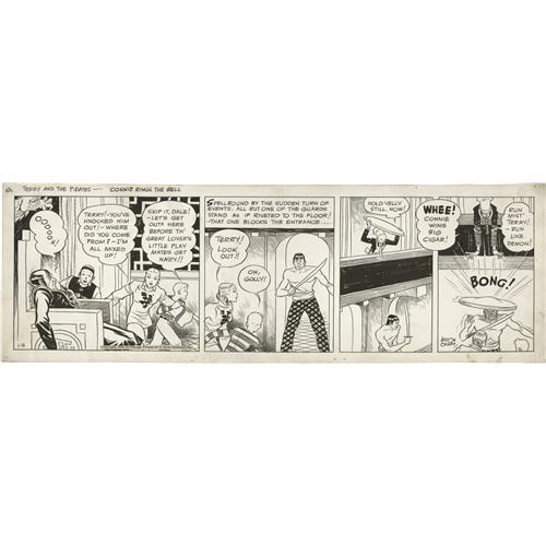 <B>Milton Caniff - Terry and the Pirates Daily Comic Strip Original Art, dated 1-15-35 (Chicago Tribune, 1935).</B></I> In the annals of action-adventure comic strip art, <I>Terry and the Pirates</B></I> ranks in the upper echelon. A masterpiece of thrilling adventures, pictured with crisp, elegant artwork, Milton Caniff has inspired generations of comic strip and comic book artists. This superb daily, entitled "Connie Rings The Bell," features Terry's number-one sidekick. Dale Scott and Terry co-star. This strip has an image area of approximately 20" x 6", and the art is in Excellent condition.