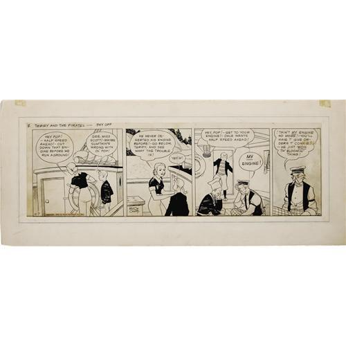 <B>Milton Caniff - Terry and the Pirates Daily Comic Strip Original Art, dated 11-7-34 (Chicago Tribune, 1934).</B></I> . Many strip aficionados feel that Milton Caniff's best work was done on <I>Terry</B></I> and it's hard to argue that opinion after experiencing the sheer fun of the early years. This daily was only the fifteenth strip published. Terry, Connie, Dale, and Pop Scott set sail for adventure - and what a run Terry had! The daily's image area measures 20" x 6". At some point the strip was cut apart through the right side area of panel two and the art has since been carefully glued to a support board; otherwise the daily is in Very Good condition. <BR><BR><B>Important notice:</B> Heritage usually auctions material at the rate of 200-250 lots per hour. On some occasions eBay Live bid software or the Internet may not be able to keep up with the pace of the auction. We recommend placing a realistic absentee bid now as insurance to avoid disappointment. Occasionally the auctioneer may eliminate or reject an eBay Live bid, and the auctioneer may also reopen a lot after the close of the eBay live bidding (usually because we missed an audience bid), and may reject your bid even if it shows you as the winning bidder. By bidding via eBay Live, you agree that Heritage may award the lot to another bidder at its sole discretion under the circumstances described above or any other reasonable circumstances. Since eBay bids are not shown to us until we open the lot on the floor, we treat those bids just like floor bids. In most cases the floor responds before the eBay bid is presented to us, due to Internet lag time, so for consistency we have made it a policy that floor bids are always considered first over tie eBay live bids. Also please note that all Heritage lots purchased through eBay Live carry a 22.5% Buyer's Premium. Please make sure you read the Terms and Conditions before you bid. This lot is being auctioned in conjunction with a live floor auction by Heritage Auction Galleries. All final auction and invoice information will be supplied by Heritage Auction Galleries, and all other information should be considered preliminary. Lot:41001 <BR><BR><B>Winning Notification and Billing:</B> After the FINAL session in this auction is complete, Heritage will send e-mail and snail mail invoices. This process normally takes several days. All final auction and invoice information will be supplied by Heritage Auction Galleries, and all other information should be considered preliminary. <BR><BR>This auction will be conducted on a live auction floor and over the Internet through eBay Live. If you choose to place an absentee bid, please take a moment to <font color='#0000ff'><u><a href='http://pages.ebay.com/liveauctions/help/before/laabsentee.html'>learn how eBay Live absentee bidding works</a></u></font><font color='#000000'>