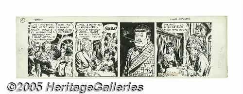 <B>Milton Caniff - Terry and the Pirates Daily Comic Strip Original Art, dated 3-23-39 (Chicago Tribune, 1939).</B></I> Sensational brushwork is the highlight of this daily as that no-goodnik and low-life, Weazel, flatters and plies a dancer for information about the dame named Sanjak. There's three sensational "good girl" panels to admire in this episode! The image area of the strip is 20" x 6" and the art is in Excellent condition.