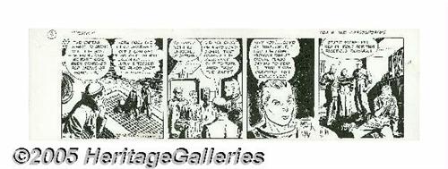 <B>Milton Caniff - Terry and the Pirates Daily Comic Strip Original Art, dated 4-16-41 (Chicago Tribune, 1941).</B></I> Terry scuttles a deadly plot to destroy a merchant ship with an explosives-filled raft, and suffers for his heroic actions in this rip-roaring daily titled "Truth and Consequences." The despicable Kiel co-stars in panels two and four. The image area of the daily is 20" x 6", and the art is in Excellent condition. Milton Caniff's chiaroscuro inking approach was at its most refined in this daily!
