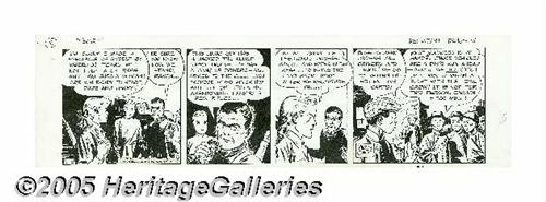 <B>Milton Caniff - Terry and the Pirates Daily Comic Strip Original Art, dated 9-8-41 (Chicago Tribune, 1941).</B></I> Raven Sherman's dangerous plan to recapture stolen refugee relief supplies is not for the faint-of-heart, but Terry and Dude Hennick are willing and able. This daily set the stage for one of the most shocking events in the history of comic strips -- the tragic death of Raven Sherman on 10-16-41. The image area of the strip measures 19.75" x 5.5", and the art is in Excellent condition.