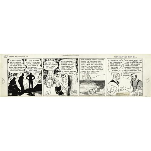 <B>Milton Caniff - Terry and the Pirates Daily Comic Strip Original Art, dated 4-9-35 (Chicago Tribune, 1935).</B></I> Milton Caniff's inked line is assured and confident in this <I>Terry</B></I> titled "They Might Pay Their Bill." Pat Ryan, Terry Lee, and Weazel all appear in this thriller. The art has an image area that measures 20" x 5.5", and the art is in Excellent condition. <BR><BR><B>Important notice:</B> Heritage usually auctions material at the rate of 200-250 lots per hour. On some occasions eBay Live bid software or the Internet may not be able to keep up with the pace of the auction. We recommend placing a realistic absentee bid now as insurance to avoid disappointment. Occasionally the auctioneer may eliminate or reject an eBay Live bid, and the auctioneer may also reopen a lot after the close of the eBay live bidding (usually because we missed an audience bid), and may reject your bid even if it shows you as the winning bidder. By bidding via eBay Live, you agree that Heritage may award the lot to another bidder at its sole discretion under the circumstances described above or any other reasonable circumstances. Since eBay bids are not shown to us until we open the lot on the floor, we treat those bids just like floor bids. In most cases the floor responds before the eBay bid is presented to us, due to Internet lag time, so for consistency we have made it a policy that floor bids are always considered first over tie eBay live bids. Also please note that all Heritage lots purchased through eBay Live carry a 22.5% Buyer's Premium. Please make sure you read the Terms and Conditions before you bid. This lot is being auctioned in conjunction with a live floor auction by Heritage Auction Galleries. All final auction and invoice information will be supplied by Heritage Auction Galleries, and all other information should be considered preliminary. Lot:41001 <BR><BR><B>Winning Notification and Billing:</B> After the FINAL session in this auction is complete, Heritage will send e-mail and snail mail invoices. This process normally takes several days. All final auction and invoice information will be supplied by Heritage Auction Galleries, and all other information should be considered preliminary. <BR><BR>This auction will be conducted on a live auction floor and over the Internet through eBay Live. If you choose to place an absentee bid, please take a moment to <font color='#0000ff'><u><a href='http://pages.ebay.com/liveauctions/help/before/laabsentee.html'>learn how eBay Live absentee bidding works</a></u></font><font color='#000000'>
