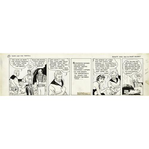 <B>Milton Caniff - Terry and the Pirates Daily Comic Strip Original Art, dated 4-16-35 (Chicago Tribune, 1935).</B></I> Milton Caniff's mastery at drawing facial expressions and body language tell the tale in this daily titled "Beauty Puts Bee in Bum's Bonnet." Normandy Drake and Weasel star. The art has an image area that measures 20" x 5.5", and the art is in Excellent condition. <BR><BR><B>Important notice:</B> Heritage usually auctions material at the rate of 200-250 lots per hour. On some occasions eBay Live bid software or the Internet may not be able to keep up with the pace of the auction. We recommend placing a realistic absentee bid now as insurance to avoid disappointment. Occasionally the auctioneer may eliminate or reject an eBay Live bid, and the auctioneer may also reopen a lot after the close of the eBay live bidding (usually because we missed an audience bid), and may reject your bid even if it shows you as the winning bidder. By bidding via eBay Live, you agree that Heritage may award the lot to another bidder at its sole discretion under the circumstances described above or any other reasonable circumstances. Since eBay bids are not shown to us until we open the lot on the floor, we treat those bids just like floor bids. In most cases the floor responds before the eBay bid is presented to us, due to Internet lag time, so for consistency we have made it a policy that floor bids are always considered first over tie eBay live bids. Also please note that all Heritage lots purchased through eBay Live carry a 22.5% Buyer's Premium. Please make sure you read the Terms and Conditions before you bid. This lot is being auctioned in conjunction with a live floor auction by Heritage Auction Galleries. All final auction and invoice information will be supplied by Heritage Auction Galleries, and all other information should be considered preliminary. Lot:41001 <BR><BR><B>Winning Notification and Billing:</B> After the FINAL session in this auction is complete, Heritage will send e-mail and snail mail invoices. This process normally takes several days. All final auction and invoice information will be supplied by Heritage Auction Galleries, and all other information should be considered preliminary. <BR><BR>This auction will be conducted on a live auction floor and over the Internet through eBay Live. If you choose to place an absentee bid, please take a moment to <font color='#0000ff'><u><a href='http://pages.ebay.com/liveauctions/help/before/laabsentee.html'>learn how eBay Live absentee bidding works</a></u></font><font color='#000000'>