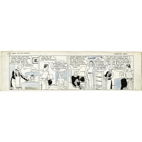<B>Milton Caniff - Terry and the Pirates Daily Comic Strip Original Art, dated 5-21-35 (Chicago Tribune, 1935).</B></I> The precision of Milton Caniff's contour line is astounding; he can make even the most domestic of scenes interesting with his bravura draftsmanship. The art has an image area that measures 20" x 5.5", and the art is in Excellent condition. <BR><BR><B>Important notice:</B> Heritage usually auctions material at the rate of 200-250 lots per hour. On some occasions eBay Live bid software or the Internet may not be able to keep up with the pace of the auction. We recommend placing a realistic absentee bid now as insurance to avoid disappointment. Occasionally the auctioneer may eliminate or reject an eBay Live bid, and the auctioneer may also reopen a lot after the close of the eBay live bidding (usually because we missed an audience bid), and may reject your bid even if it shows you as the winning bidder. By bidding via eBay Live, you agree that Heritage may award the lot to another bidder at its sole discretion under the circumstances described above or any other reasonable circumstances. Since eBay bids are not shown to us until we open the lot on the floor, we treat those bids just like floor bids. In most cases the floor responds before the eBay bid is presented to us, due to Internet lag time, so for consistency we have made it a policy that floor bids are always considered first over tie eBay live bids. Also please note that all Heritage lots purchased through eBay Live carry a 22.5% Buyer's Premium. Please make sure you read the Terms and Conditions before you bid. This lot is being auctioned in conjunction with a live floor auction by Heritage Auction Galleries. All final auction and invoice information will be supplied by Heritage Auction Galleries, and all other information should be considered preliminary. Lot:41001 <BR><BR><B>Winning Notification and Billing:</B> After the FINAL session in this auction is complete, Heritage will send e-mail and snail mail invoices. This process normally takes several days. All final auction and invoice information will be supplied by Heritage Auction Galleries, and all other information should be considered preliminary. <BR><BR>This auction will be conducted on a live auction floor and over the Internet through eBay Live. If you choose to place an absentee bid, please take a moment to <font color='#0000ff'><u><a href='http://pages.ebay.com/liveauctions/help/before/laabsentee.html'>learn how eBay Live absentee bidding works</a></u></font><font color='#000000'>