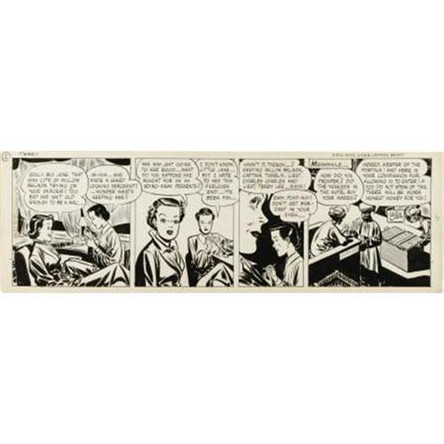 <B>Milton Caniff - Terry and the Pirates Daily Comic Strip Original Art, dated 11-13-44 (Chicago Tribune, 1944). </B></I> Three panels of lovely Milton Caniff gals are the highlights of this World War II-era <I>Terry</B></I>. This daily features masterful inking, as always, by one of the pillars of action-adventure cartooning. The image area of this strip is 21.5" x 6.5", and the condition of the art is Excellent.<BR><BR><b>Shipping:</b> Flat Material, Large (<a target="_blank" href="http://www.heritageauctions.com/common/shipping.php">view shipping information</a>)