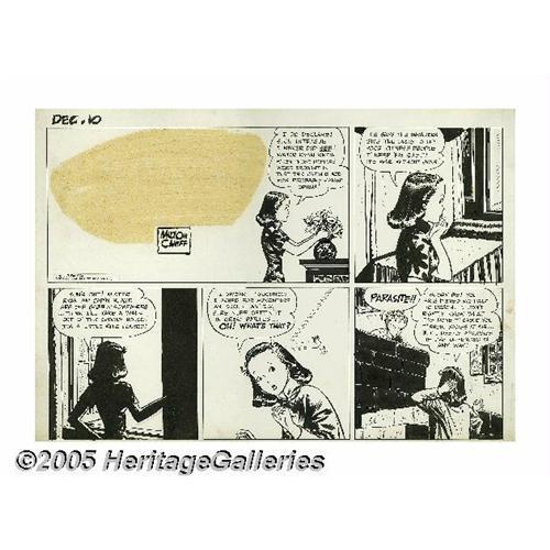 <B>Milton Caniff - Terry and the Pirates Partial Sunday Comic Strip Original Art, dated 12-10-39 (News Syndicate, 1939).</B></I> Milton Caniff 's cast of characters for <I>Terry and the Pirates</B></I> has seldom been matched. Even with its exotic locales, bizarre villains, and luscious women, Caniff respected his players, and kept the stories believable. Intrigue and adventure aside, April Kane still has to deal with a disgruntled neighbor, in this upper portion of a Sunday from 1939. The image area measures 19"" x 13"". There is a glue stain from a missing logo photostat in the first frame, some slight aging along the extreme edges, and some light staining along the right edge, otherwise the art is in Excellent condition. <BR><BR><B>Important notice:</B> Heritage usually auctions material at the rate of 200-250 lots per hour. On some occasions eBay Live bid software or the Internet may not be able to keep up with the pace of the auction. We recommend placing a realistic absentee bid now as insurance to avoid disappointment. Occasionally the auctioneer may eliminate or reject an eBay Live bid, and the auctioneer may also reopen a lot after the close of the eBay live bidding (usually because we missed an audience bid), and may reject your bid even if it shows you as the winning bidder. By bidding via eBay Live, you agree that Heritage may award the lot to another bidder at its sole discretion under the circumstances described above or any other reasonable circumstances. Since eBay bids are not shown to us until we open the lot on the floor, we treat those bids just like floor bids. In most cases the floor responds before the eBay bid is presented to us, due to Internet lag time, so for consistency we have made it a policy that floor bids are always considered first over tie eBay live bids. Also please note that all Heritage lots purchased through eBay Live carry a 20% Buyer's Premium. Please make sure you read the Terms and Conditions before you bid. This lot is bei
