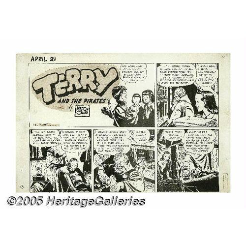 <B>Milton Caniff - Terry and the Pirates Partial Sunday Comic Strip Original Art, dated 4-21-40 (News Syndicate, 1940).</B></I> Captain Blaze and April Kane prepare the children for bed, in the upper two tiers of this <I>Terry and the Pirates</B></I> Sunday from 1940. Milton Caniff suffuses this subtle scenario with a caring atmosphere. The image area measures of 19"" x 12.5"", and the art is in Excellent condition. <BR><BR><B>Important notice:</B> Heritage usually auctions material at the rate of 200-250 lots per hour. On some occasions eBay Live bid software or the Internet may not be able to keep up with the pace of the auction. We recommend placing a realistic absentee bid now as insurance to avoid disappointment. Occasionally the auctioneer may eliminate or reject an eBay Live bid, and the auctioneer may also reopen a lot after the close of the eBay live bidding (usually because we missed an audience bid), and may reject your bid even if it shows you as the winning bidder. By bidding via eBay Live, you agree that Heritage may award the lot to another bidder at its sole discretion under the circumstances described above or any other reasonable circumstances. Since eBay bids are not shown to us until we open the lot on the floor, we treat those bids just like floor bids. In most cases the floor responds before the eBay bid is presented to us, due to Internet lag time, so for consistency we have made it a policy that floor bids are always considered first over tie eBay live bids. Also please note that all Heritage lots purchased through eBay Live carry a 20% Buyer's Premium. Please make sure you read the Terms and Conditions before you bid. This lot is being auctioned in conjunction with a live floor auction by Heritage Galleries & Auctioneers. All final auction and invoice information will be supplied by Heritage Galleries & Auctioneers, and all other information should be considered preliminary. Lot:4102 <BR><BR><B>Winning Notification and Billing:</B> After the