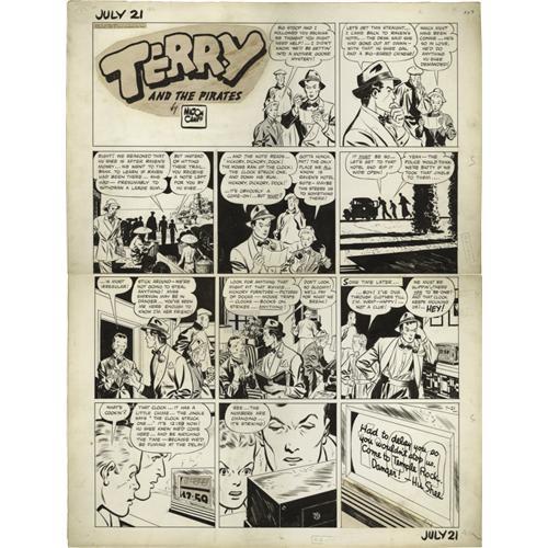 <B>Milton Caniff - Terry and the Pirates Sunday Comic Strip Original Art, dated 7-21-40 (Chicago Tribune, 1940).</B></I> Pat Ryan, Terry, and Big Stoop hunt for clues to track down Connie and Hu Shee in this suspense-filled Sunday. Milton Caniff 's picaresque cast of characters for Terry has rarely been matched. Caniff is in full command of the chiaroscuro inking technique he developed with his friend, Noel Sickles -- their work revolutionized adventure strip cartooning. The image area of this Sunday measures 19" x 26". The art was cut between panel tiers two and three, and the title logo stat has light glue staining; otherwise, the art is in Very Good condition.