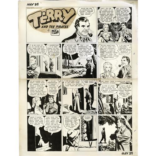 <B>Milton Caniff - Terry and the Pirates Sunday Comic Strip Original Art, dated 5-25-41 (Chicago Tribune, 1941).</B></I> Burma and Terry match wits with the nefarious Mr. Wolff in this superbly orchestrated Sunday. Milton Caniff's plotting, characterization, and dialogue raised the adventure strip to new heights, and his approach to storytelling became the model for innumerable comic book artists. The image area of this Sunday measures 19" x 26". The page was cut between panel tiers two and three, and the title logo stat has glue staining; otherwise, the art is in Very Good condition.
