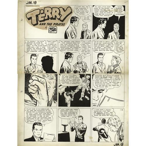 <B>Milton Caniff - Terry and the Pirates Sunday Comic Strip Original Art, dated 1-18-42 (Chicago Tribune, 1942).</B></I> Two-fisted adventurer Pat Ryan knocks down the conniving "Sammy, the Tap" in this hard-hitting Sunday -- readers must have loved that! But look out Pat, here comes the counter-punch. The image area of this Sunday is 19" x 26". The strip was cut between panel tiers two and three, the title logo stat has light glue staining, and there are a few light stains; otherwise, the art is in Very Good condition.