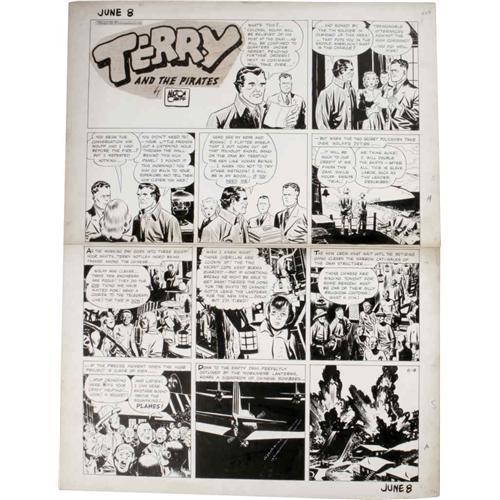 <B>Milton Caniff - Terry and the Pirates Sunday Comic Strip Original Art, dated 6-8-41 (The Chicago Tribune, 1941).</B></I> Terry and Burma co-star in these scenes of undercover intrigue. Milton Caniff used his renowned black and white art contrasts to heighten the dramatic mood of these scenes. This Sunday's image area measures 19" x 26". The strip was cut between panel tiers two and three; otherwise, the art is in Excellent condition.