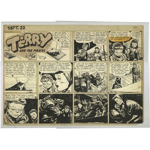 <B>Milton Caniff - Terry and the Pirates Sunday Comic Strip Original Art, dated 8-22-46 (The Chicago Tribune, 1946).</B></I> Milton Caniff staged these scenes between Hotshot Charlie and Nasty using a panel flow that reads like a storyboard for a film. Note the excellent framing of the figures in each panel. Caniff's sense of pacing is unparalled in the comic strip field. The strip's image area measures 25" x 17". Each panel of this Sunday was cut apart and glued to a larger support paper, with the art extended to the edges of the panels. There is also some paper aging, and a missing lettering correction in panel three; otherwise, the art is in Very Good condition.