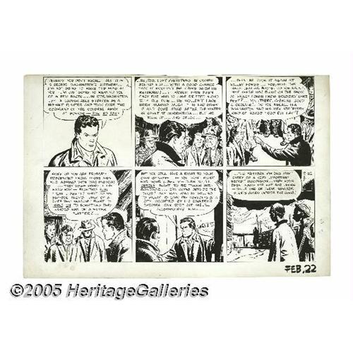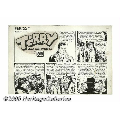 <B>Milton Caniff - Terry and the Pirates Sunday Comic Strip Original Art, dated 2-22-42 (Chicago Tribune, 1942).</B></I> Pat Ryan tries to bolster his war-weary comrades' <I>e'sprit de corps</B></I> by contrasting their troubles with the tremendous sacrifices George Washington made on behalf of America -- few cartoonists could wave the flag as well as Milton Caniff! The image area of the strip measures 19"" x 26"" and the strip was cut between panel tiers two and three. The title stat shows mild signs of aging and glue staining; otherwise the art is in Excellent condition. <BR><BR><B>Important notice:</B> Heritage usually auctions material at the rate of 200-250 lots per hour. On some occasions eBay Live bid software or the Internet may not be able to keep up with the pace of the auction. We recommend placing a realistic absentee bid now as insurance to avoid disappointment. Occasionally the auctioneer may eliminate or reject an eBay Live bid, and the auctioneer may also reopen a lot after the close of the eBay live bidding (usually because we missed an audience bid), and may reject your bid even if it shows you as the winning bidder. By bidding via eBay Live, you agree that Heritage may award the lot to another bidder at its sole discretion under the circumstances described above or any other reasonable circumstances. Since eBay bids are not shown to us until we open the lot on the floor, we treat those bids just like floor bids. In most cases the floor responds before the eBay bid is presented to us, due to Internet lag time, so for consistency we have made it a policy that floor bids are always considered first over tie eBay live bids. Also please note that all Heritage lots purchased through eBay Live carry a 20% Buyer's Premium. Please make sure you read the Terms and Conditions before you bid. This lot is being auctioned in conjunction with a live floor auction by Heritage Galleries & Auctioneers. All final auction and invoice information will be supplied by H