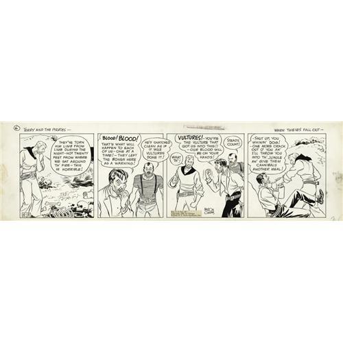 <B>Milton Caniff - Terry and the Pirates Daily Comic Strip Original Art, dated 4-13-35 (Chicago Tribune, 1935).</B></I> Even before Milton Caniff incorporated Noel Sickles' cartooning innovations, Caniff proved himself a master draftsman, as this daily titled, "When Thieves Fall Out" shows. Weazel and his crew of kidnappers star. The art has an image area that measures 20" x 5.5", and the art is in Excellent condition. <BR><BR><B>Important notice:</B> Heritage usually auctions material at the rate of 200-250 lots per hour. On some occasions eBay Live bid software or the Internet may not be able to keep up with the pace of the auction. We recommend placing a realistic absentee bid now as insurance to avoid disappointment. Occasionally the auctioneer may eliminate or reject an eBay Live bid, and the auctioneer may also reopen a lot after the close of the eBay live bidding (usually because we missed an audience bid), and may reject your bid even if it shows you as the winning bidder. By bidding via eBay Live, you agree that Heritage may award the lot to another bidder at its sole discretion under the circumstances described above or any other reasonable circumstances. Since eBay bids are not shown to us until we open the lot on the floor, we treat those bids just like floor bids. In most cases the floor responds before the eBay bid is presented to us, due to Internet lag time, so for consistency we have made it a policy that floor bids are always considered first over tie eBay live bids. Also please note that all Heritage lots purchased through eBay Live carry a 22.5% Buyer's Premium. Please make sure you read the Terms and Conditions before you bid. This lot is being auctioned in conjunction with a live floor auction by Heritage Auction Galleries. All final auction and invoice information will be supplied by Heritage Auction Galleries, and all other information should be considered preliminary. Lot:41001 <BR><BR><B>Winning Notification and Billing:</B> After the FINAL session in this auction is complete, Heritage will send e-mail and snail mail invoices. This process normally takes several days. All final auction and invoice information will be supplied by Heritage Auction Galleries, and all other information should be considered preliminary. <BR><BR>This auction will be conducted on a live auction floor and over the Internet through eBay Live. If you choose to place an absentee bid, please take a moment to <font color='#0000ff'><u><a href='http://pages.ebay.com/liveauctions/help/before/laabsentee.html'>learn how eBay Live absentee bidding works</a></u></font><font color='#000000'>