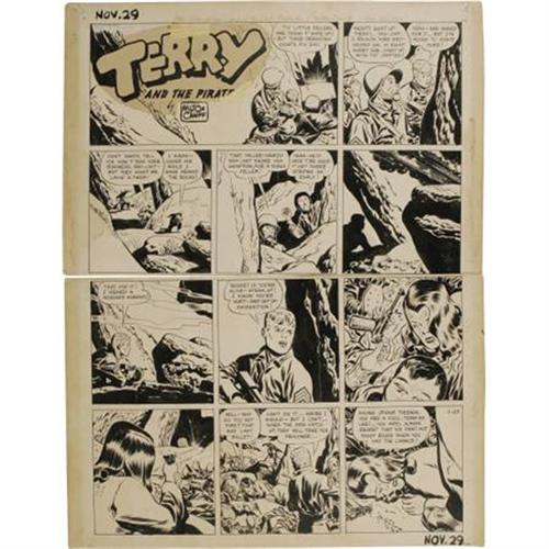 <B>Milton Caniff - Terry and the Pirates Sunday Comic Strip Original Art, dated 11-29-42 (Chicago Tribune, 1942). </B></I> Rouge suffers her Waterloo at the hands of Sgt. Terry Lee in this starkly shadowed Sunday. Milton Caniff's plotting, characterization, and dialogue were just as influential on action-adventure cartoonists as his superb draftsmanship. This Sunday's image area measures 19" x 26". The strip was cut between panel tiers two and three and the paper has some stains, creases, and shows signs of paper aging; otherwise, the art is in Good condition. This Sunday was signed and inscribed by Milton Caniff in its upper border. <I>From the Jim Logan Collection.</B></I><BR><BR><b>Shipping:</b> Flat Material, Small (<a target="_blank" href="http://www.heritageauctions.com/common/shipping.php">view shipping information</a>)
