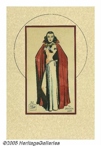 <B>Milton Caniff - The Dragon Lady Hand-Colored Print (undated).</B></I> No cartoonist influenced more of his contemporaries and generations of new artists and writers than Milton Caniff. Scholars believe that Caniff "revitalized" the style of newspaper adventure strips with <B>Terry and the Pirates</B></I>' world-hopping escapades, featuring a supporting cast as exotic as his famous dangerous women. Who can forget the mysterious and beautiful Dragon Lady? Caniff presents his ultimate <I>femme fatale</B></I> in this alluring hand-painted print. The image area measures 7.5" x 13" and although there is a bit of water damage, most noticeable along the bottom edge, and some overall aging apparent, the art is still in Very Good condition.