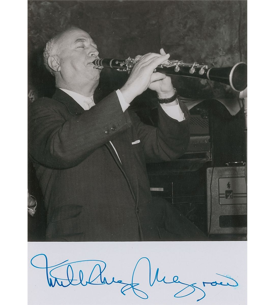 Highly regarded jazz clarinetist and saxophonist (1899–1972). Vintage glossy 5 x 7 photo, signed in the lower border in fountain pen. In fine condition, with a couple scattered creases and a slight brush to end of signature.