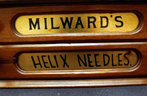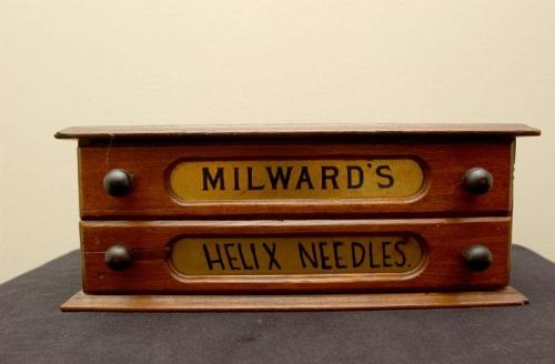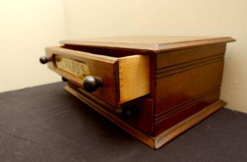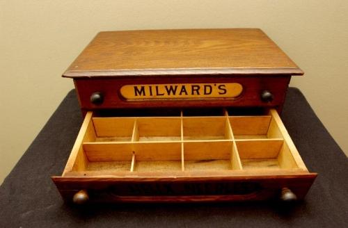 20th century walnut case, Milward's Heliby, small crack on bottom drawer, 5" by 13 /4" by 8 1/4"